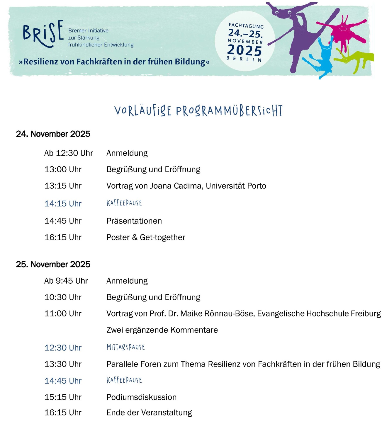 BRISE-Fachtagungen dienen dem Dialog zwischen Praxis, Politik, Verwaltung, Wissenschaft und Zivilgesellschaft und einem gemeinsamen Engagement für eine erfolgreiche Politik der frühen Kindheit. Die diesjährige Fachtagung widmet sich gezielt dem Thema "Resilienz von Fachkräften in der frühen Bildung".