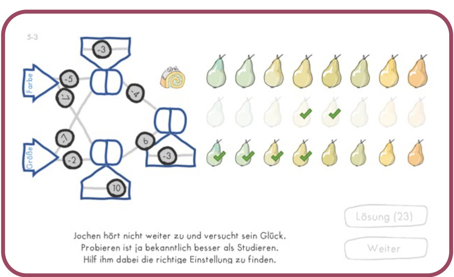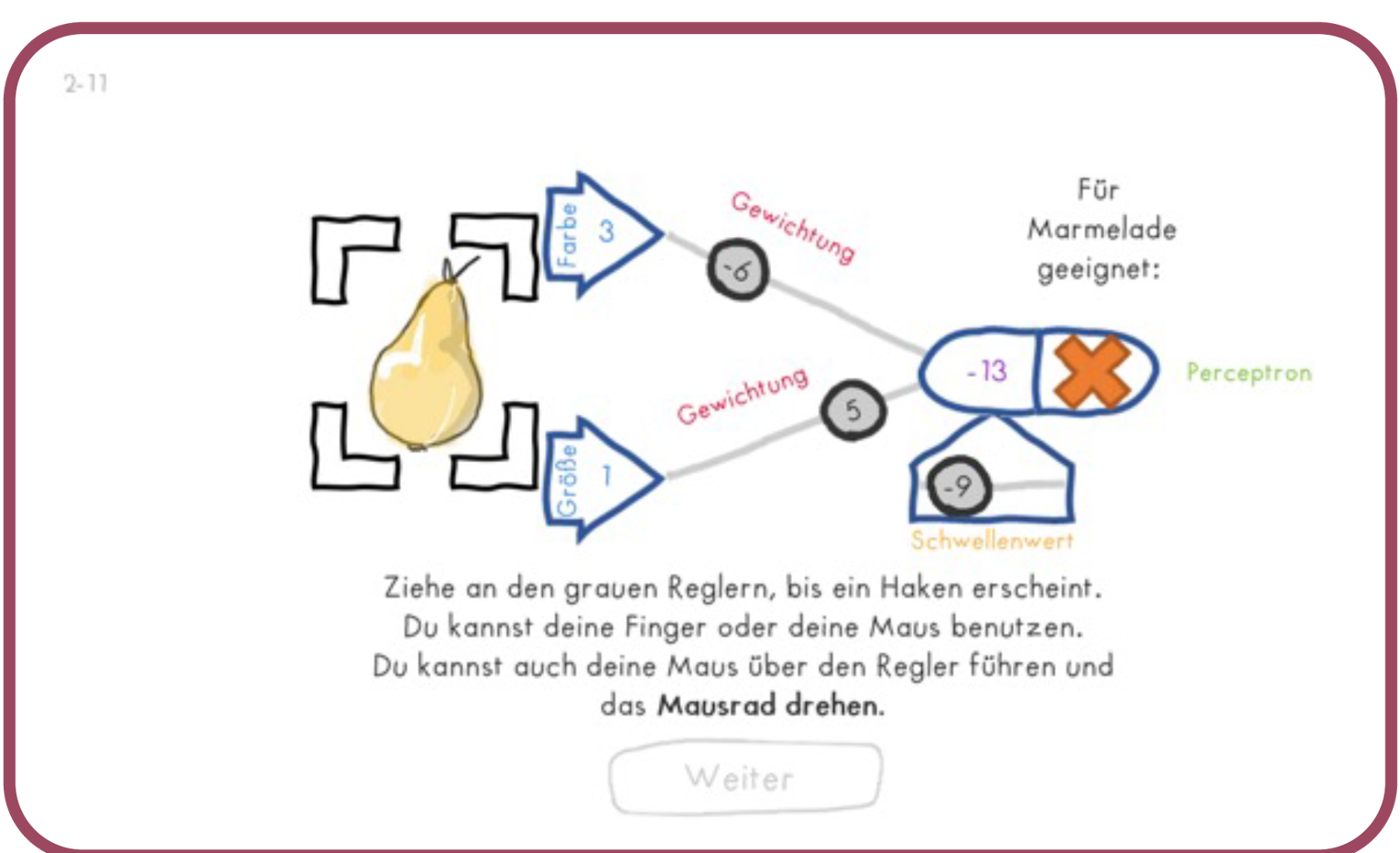 Ein Beispiel für die erste Variante, eine stark aufbereitete Umgebung, ist „Perzeptron“. Hier wird anhand eines interaktiven Comics die Funktionsweise einfacher neuronaler Netze im Kontext der Klassifikation beschrieben. Mit den Parametern eines sehr einfachen Netzes (dem Perzeptron) können Schülerinnen und Schüler zunächst experimentieren und dabei den Lernprozess selbst übernehmen. Für ein komplexeres Netz stößt dieses Vorgehen aber an seine Grenzen und die Notwendigkeit einer automatisierten Optimierung („Lernen“) wird erfahrbar.