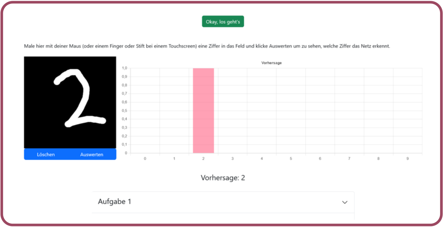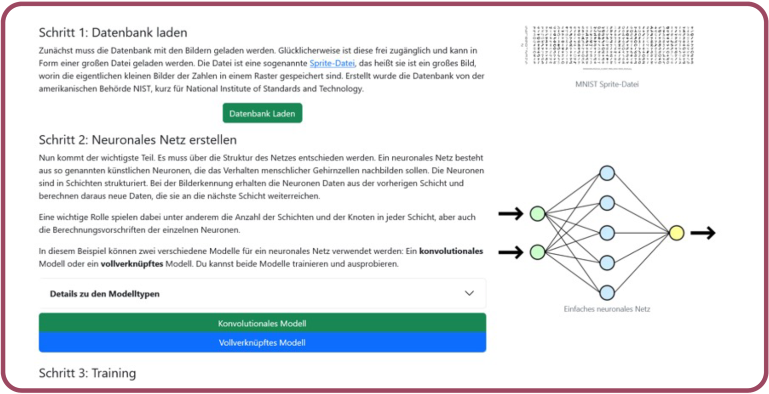 Im Gegensatz dazu wird in der Lernumgebung „MNIST Zahlenerkennung“ mit einem leistungsfähigen neuronalen Netz gearbeitet, das auf einem klassischen Datensatz des maschinellen Lernens beruht – die sogenannte „MNIST" Datenbank. Es geht bei der Lernumgebung um die Fähigkeit von neuronalen Netzen bei der Handschrifterkennung, eine Technik, die z. B. bei der automatischen Sortierung von Briefen zum Einsatz kommt. Zunächst werden Schülerinnen und Schüler zu einem experimentellen Herangehen an ein fertig trainiertes Netz angeleitet. Ziel ist, die Leistungsfähigkeit des trainierten Netzes im Vergleich zum Menschen zu überprüfen. In einem zweiten Schritt heißt es dann: Das Netz selbst trainieren. Die Lernparameter (Hyperparameter) werden zugänglich gemacht und ein untrainiertes Netz kann anhand dieser trainiert werden. Dabei wird erkennbar, dass das Lernen selbst ein gesteuerter, algorithmischer Prozess ist und dass am Ende nicht immer ein ähnlich leistungsfähiges Netz entsteht. Auch die Notwendigkeit leistungsfähiger Hardware wird in diesem Zusammenhang erfahrbar, da das Lernen durchaus die Hardware moderner Systeme beansprucht und auch eine Weile dauert. Aktuell stehen bereits 13 Lernumgebungen online zur freien Verfügung. Sie werden fortlaufend im Unterricht überprüft, wobei sich für die beiden hier vorgestellten Lernumgebungen zeigte, dass sie im Rahmen des Informatikunterrichts in der Sekundarstufe II von Schülerinnen und Schülern selbstständig bearbeitet werden können und Lernerfolge messbar sind. Weitere Angebote werden – zum Beispiel im Rahmen von studentischen Abschlussarbeiten – fortlaufend entwickelt.