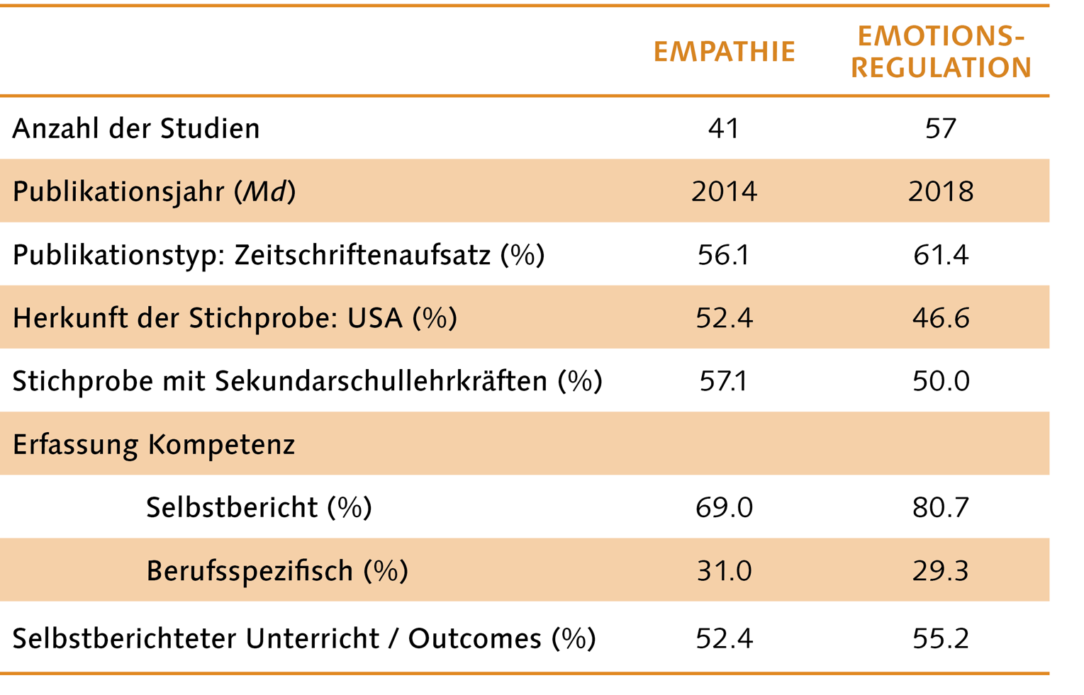 Eine systematische Literaturrecherche in einschlägigen Datenbanken ergab 41 relevante Studien zur Empathie von Lehrkräften und 57 Studien zur Emotionsregulation. Bemerkenswert ist, dass die Mehrzahl der Studien innerhalb der vergangenen zehn Jahre veröffentlicht wurde, was auf ein noch junges Forschungsfeld hindeutet. Meist wurden die Lehrkräfte um eine Selbsteinschätzung ihrer Empathie bzw. Emotionsregulation gebeten, wobei vielfach eine allgemeine Einschätzung ohne Bezug zur beruflichen Tätigkeit erfolgte. Auch die Qualität der Lehrer-Schüler-Interaktion sowie die Outcomes der Schülerinnen und Schüler wurden überwiegend von den Lehrkräften selbst beurteilt.
