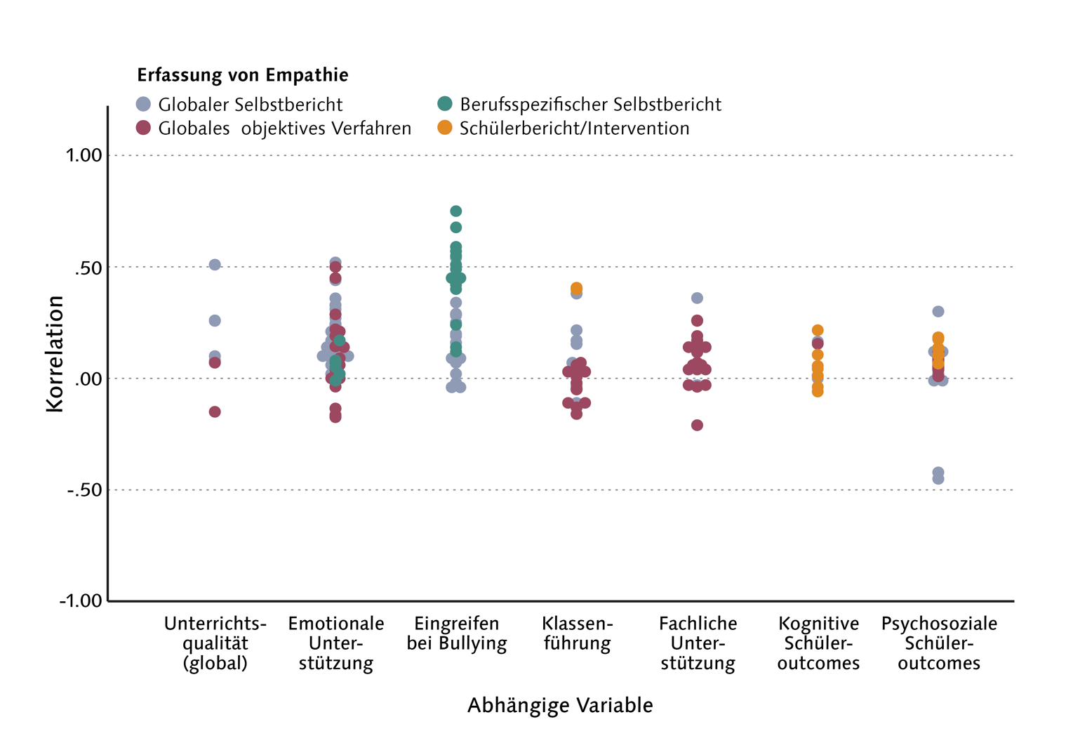 In der Mehrzahl der Studien war die Empathie der Lehrkraft nicht mit den drei Basisdimensionen der Unterrichtsqualität assoziiert, das heißt weder mit emotionaler Unterstützung, Klassenführung oder fachlicher Unterstützung noch mit globalen Einschätzungen der Unterrichtsqualität zeigten sich Zusammenhänge. Einzig für den Umgang mit Bullying, der als ein Teilaspekt von emotionaler Unterstützung betrachtet werden kann, zeigte sich, dass Lehrkräfte, die in hypothetischen Szenarien mehr Empathie mit Opfern von Bullying empfanden, eher bereit waren, diese zu unterstützen und zu intervenieren. Auch zwischen der Empathie der Lehrkraft und der kognitiven und psychosozialen Entwicklung der Schülerinnen und Schüler zeigten sich kaum Zusammenhänge.
