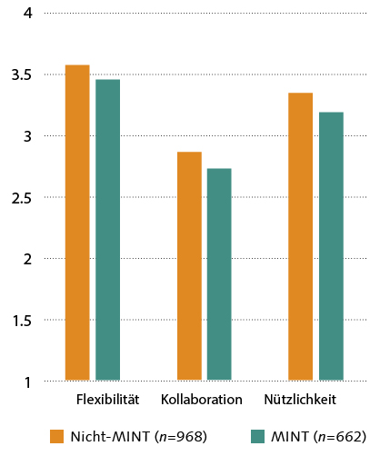 Abbildung 1: Nutzung einer digitalen Lernplattform: Mittelwerte der Motivation von Studierenden, digitale Lernangebote zu nutzen, hinsichtlich Flexibilität (M = NichtMINT 3.57/ MINT 3.46), Kollaboration (M = 2.86/2.73) und Nützlichkeit (M = 3.35/3.19), unterteilt nach Teilnehmer* innen, die ein sozial- oder geisteswissenschaftliches Fach (Nicht-MINT)- bzw. ein Fach mit Bezug zur Mathematik, Informatik, zu den Naturwissenschaften oder der Technik (MINT) studierten. 1 = „stimme nicht zu“; 4 = „stimme zu“